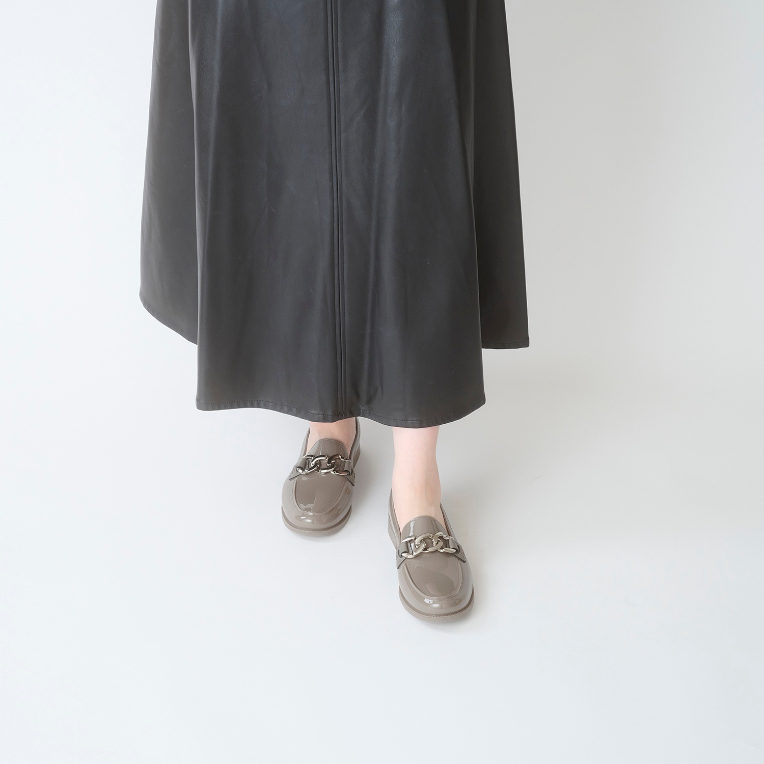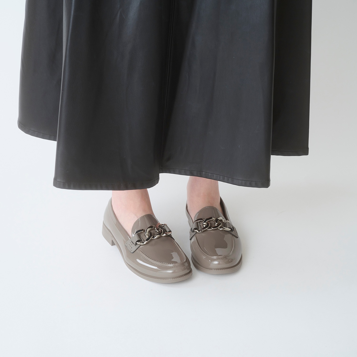 カジュアルにもオフィススタイルにも合わせやすい、キレイめなルックスのローファー。落ち着いたクラシックな雰囲気に、チェーンの輝きがおしゃれ心をくすぐる一足です。