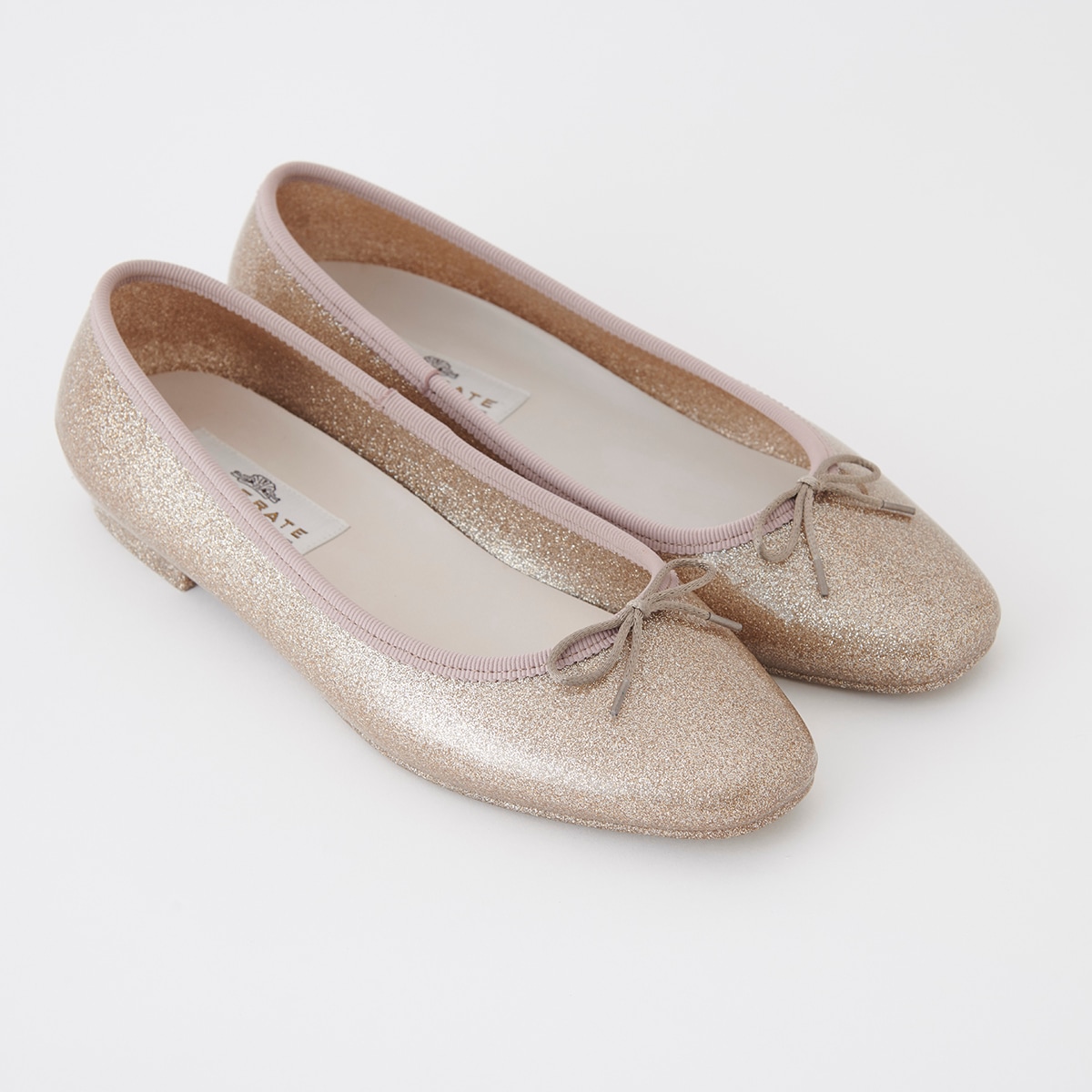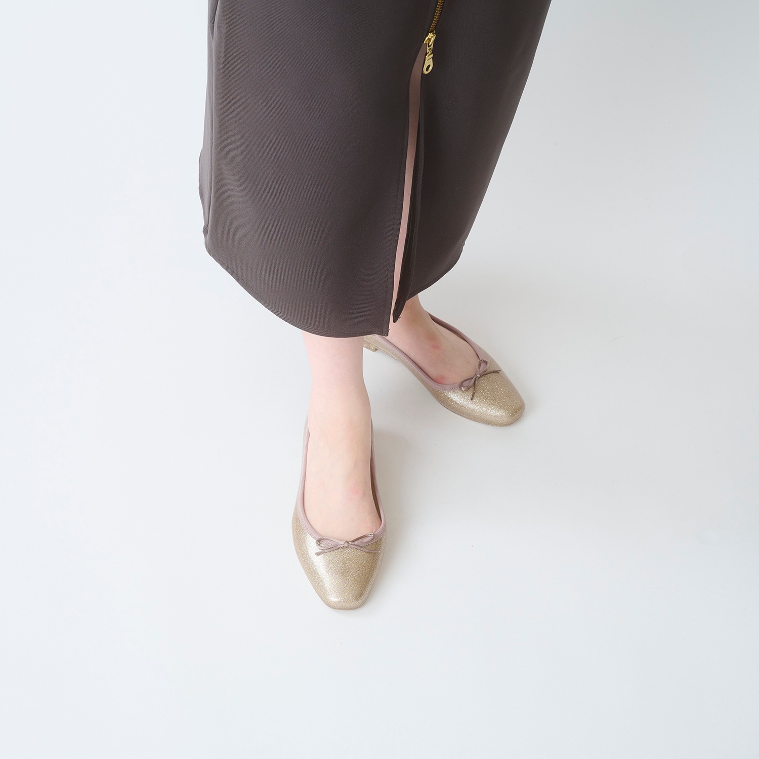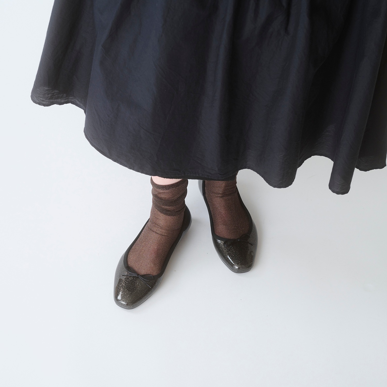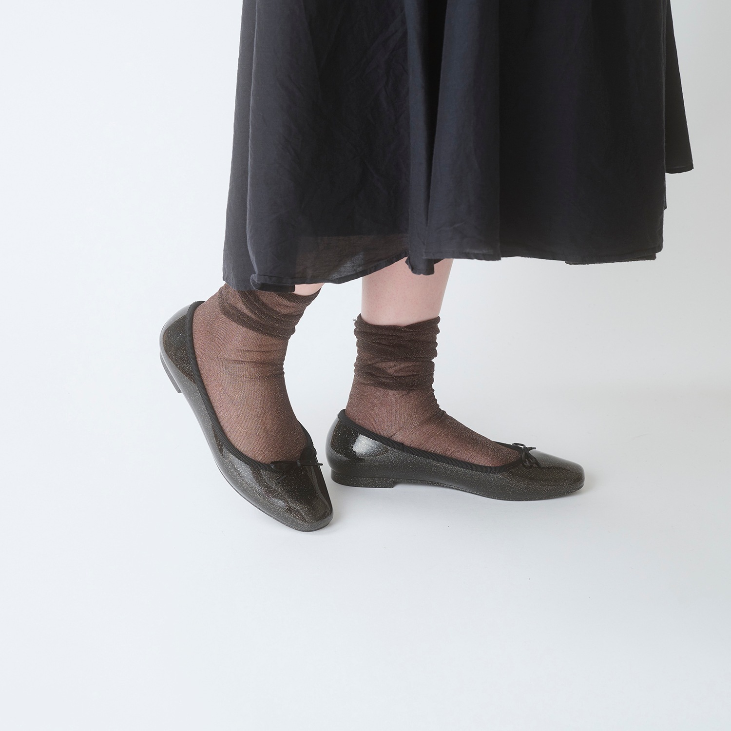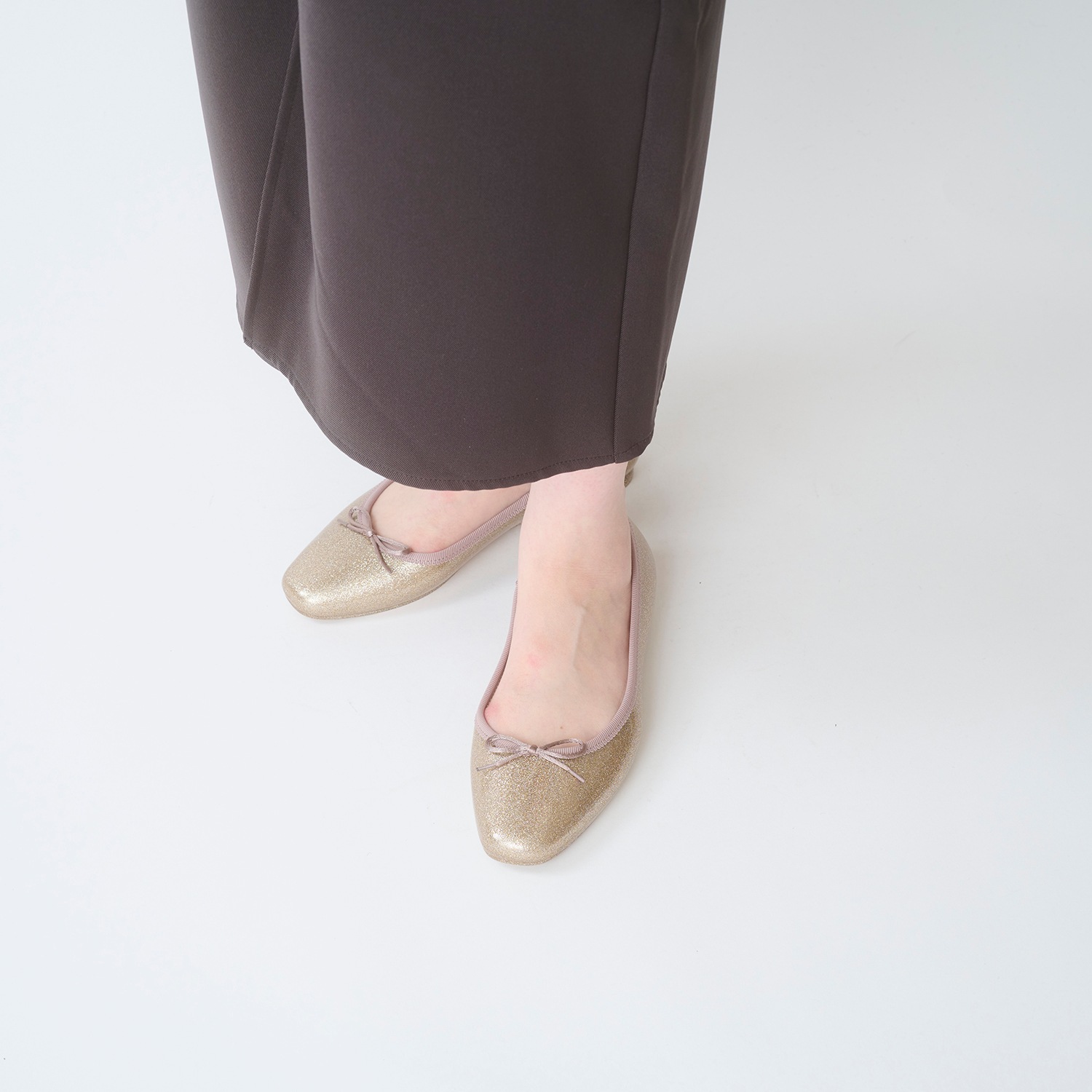 細かい粒子のグリッターをぎっしりと詰め込み、足元に繊細な輝きを纏える一足。グリッターは素材内部に閉じ込めており、剥がれ落ちる心配もありません。