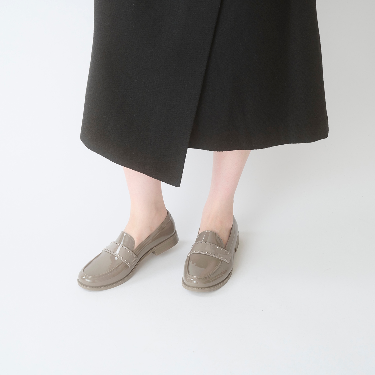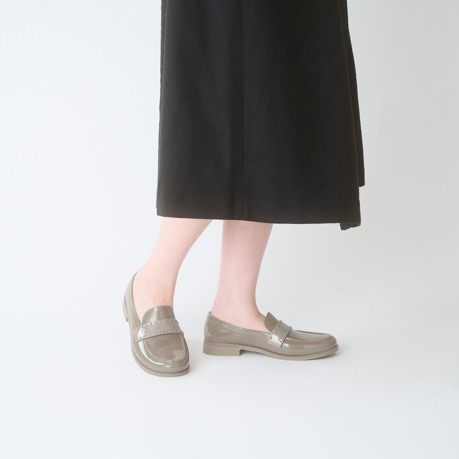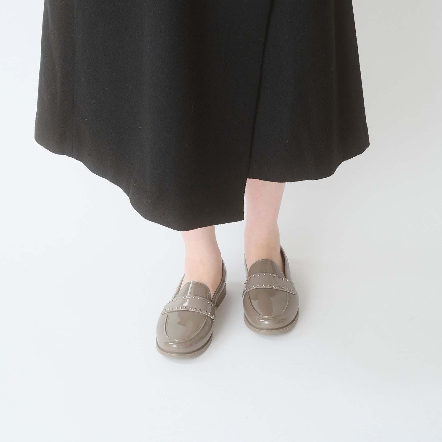 3mmの極小シルバースタッズを、エナメル合成皮革ベルトに手作業で打ち込み。すっきりとした見た目に、スタッズのアクセントが小気味良い一足に仕上げました。