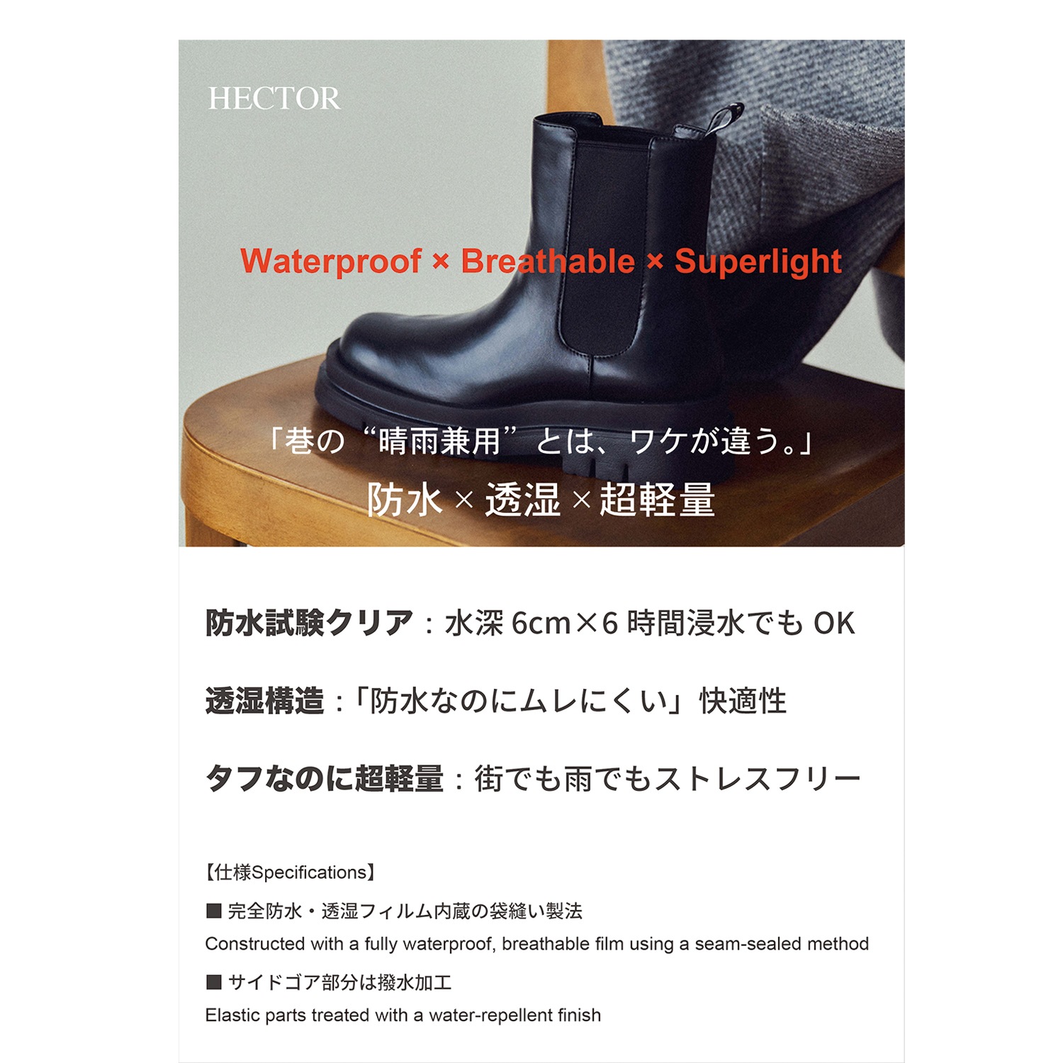 新モデル「HECTOR(ヘクター)」は、完全防水・透湿性を備えた特殊フィルムを内蔵し、袋縫い製法で仕立てた本格派サイドゴアブーツです。