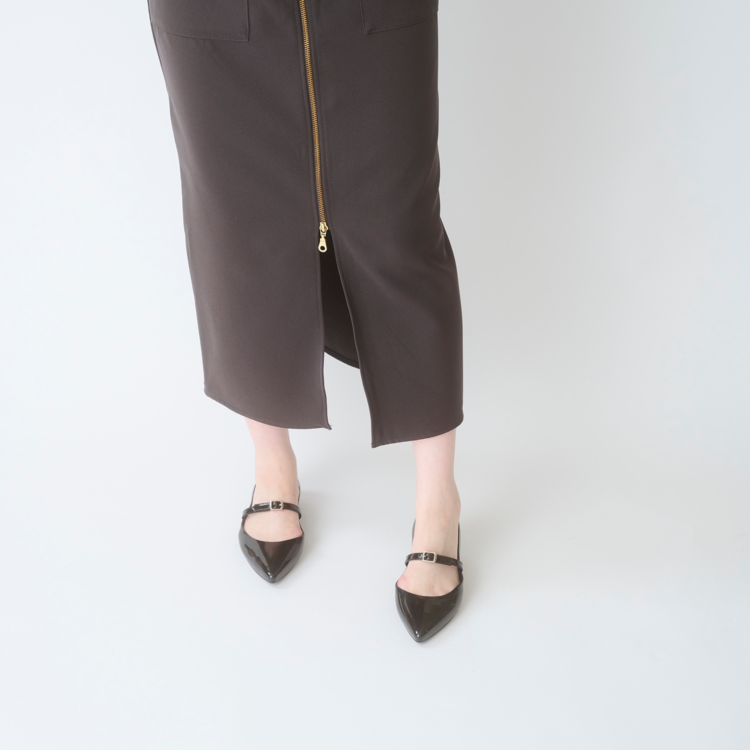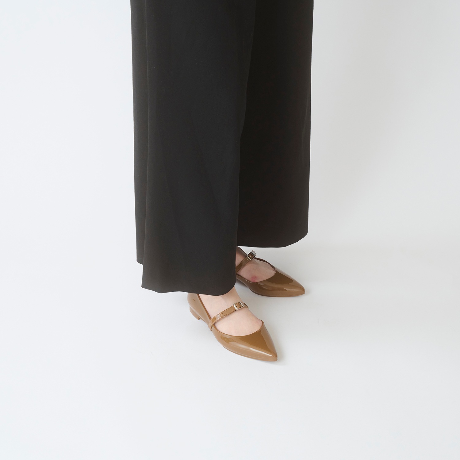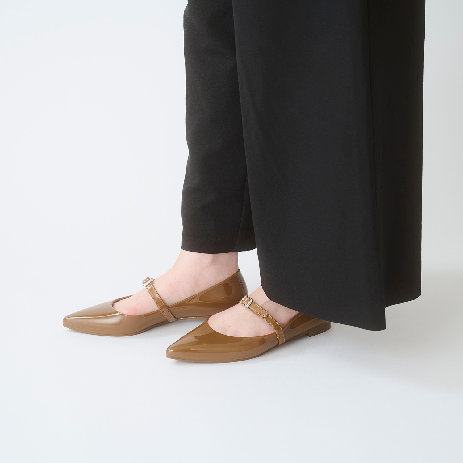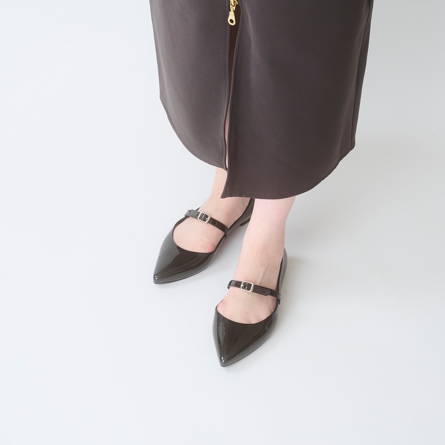 ポインテッドパンプスに細めのエナメル合皮ストラップを合わせた、甘くないメリージェーンが登場。小さなシルバーバックルをセンターに配置することで、スタイリッシュな仕上がりに。ストラップは長さの微調整が可能で、バックル下にゴムを縫い止めてあるため足入れもスムーズです。