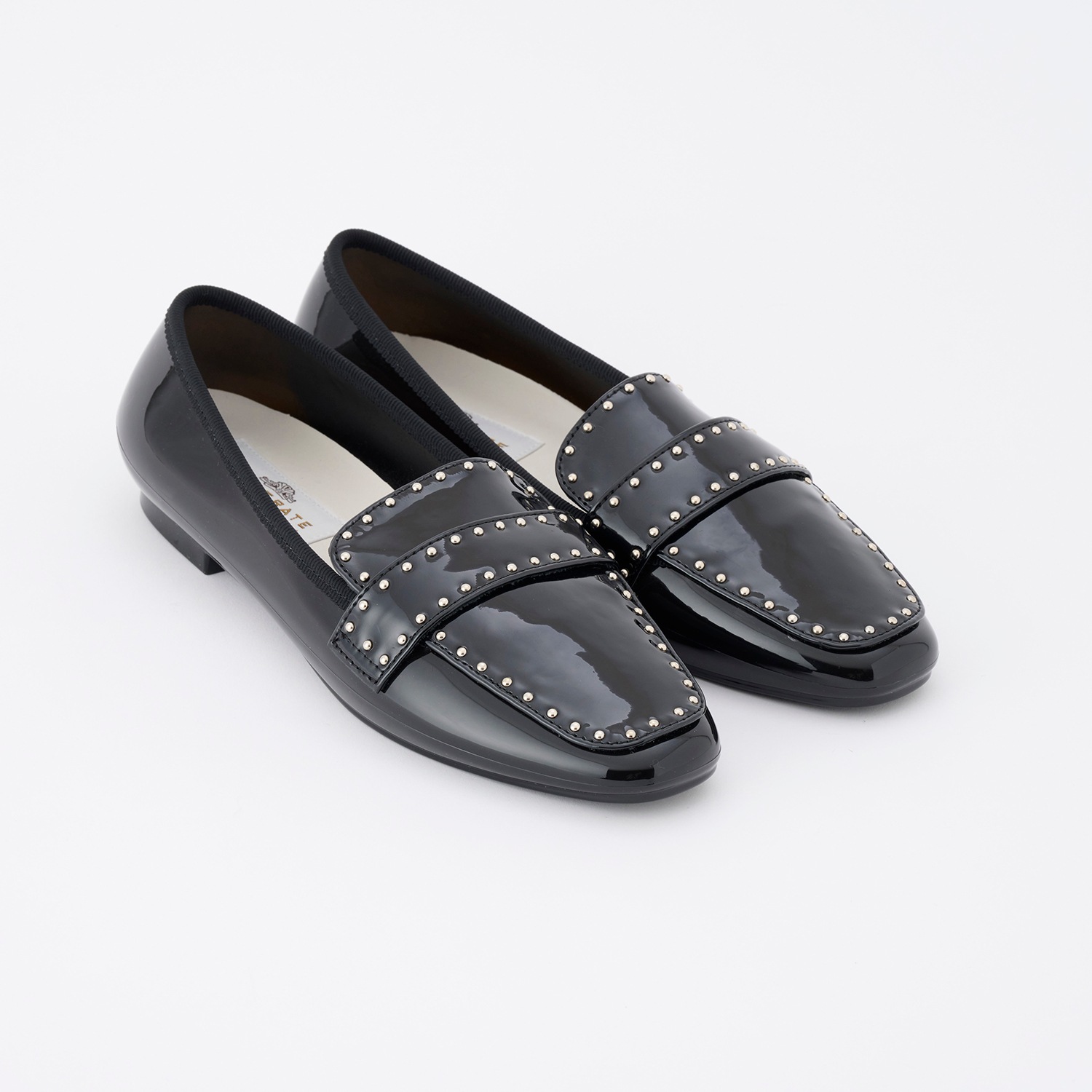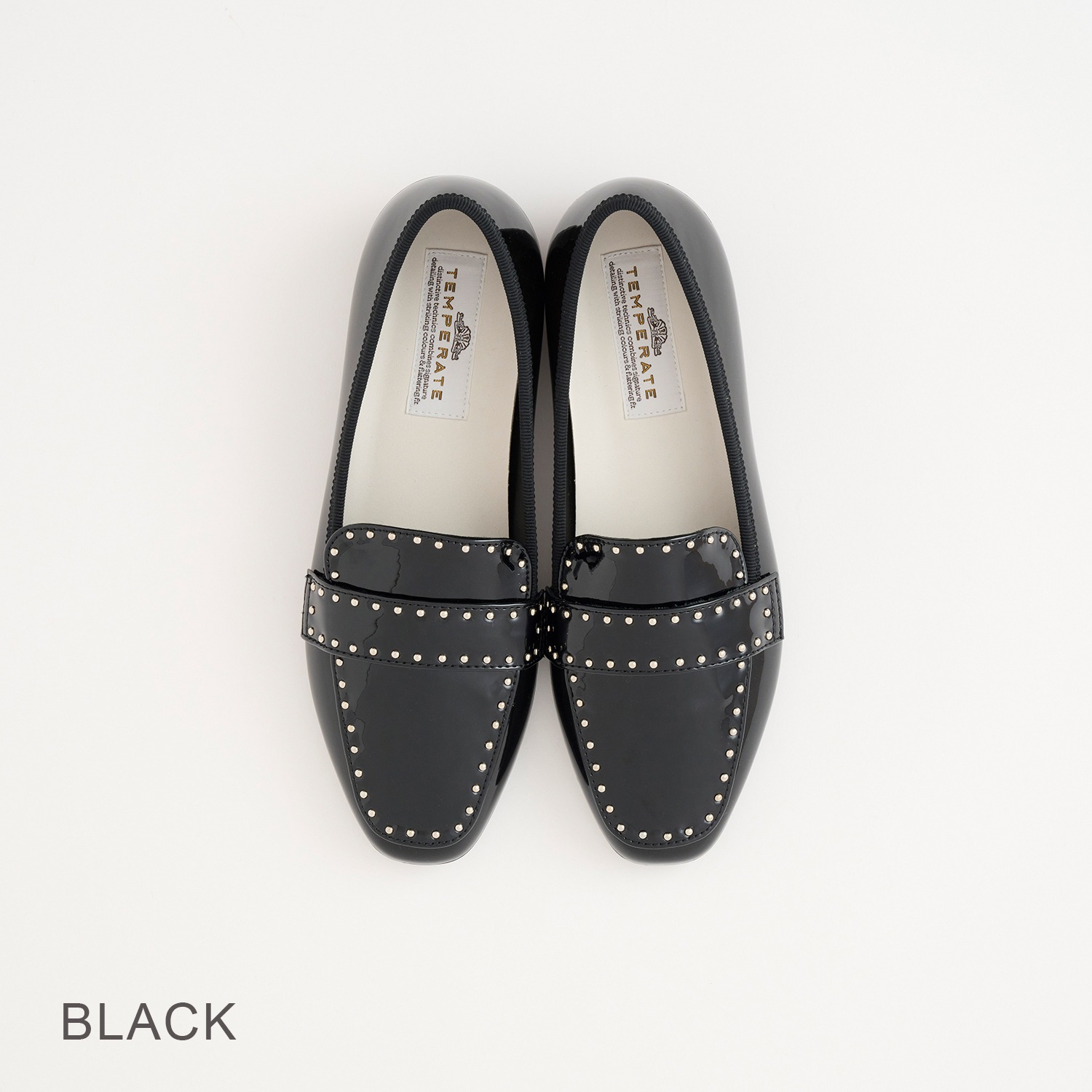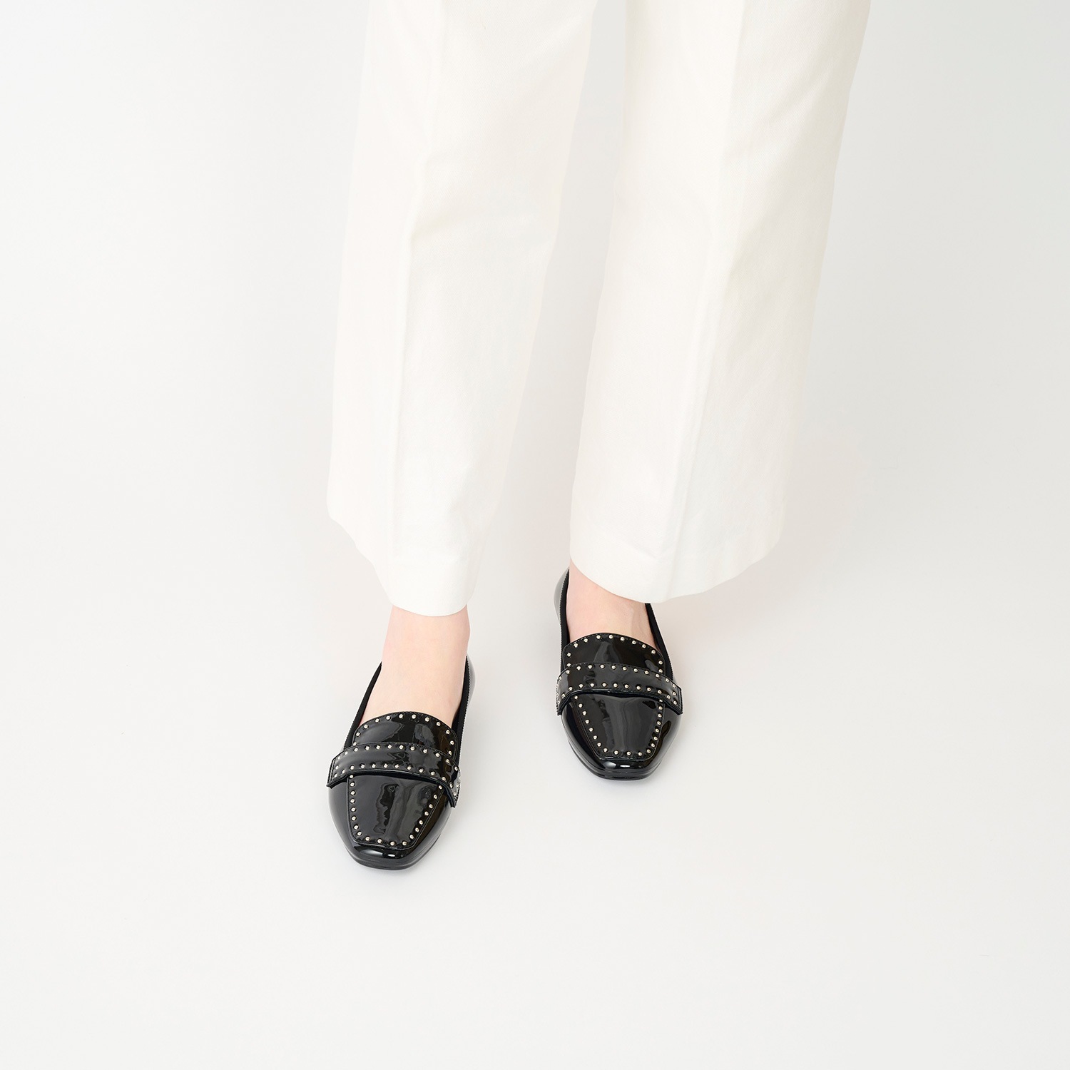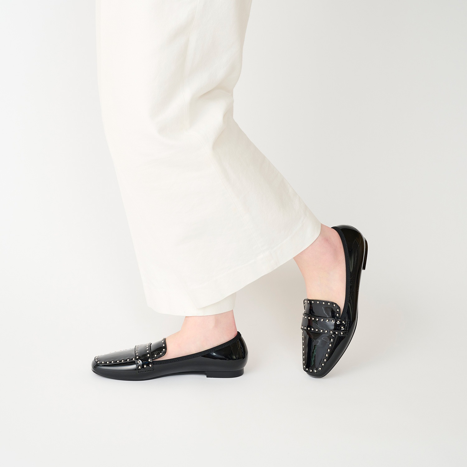 3mmの極小シルバースタッズを、エナメル調の合成皮革アッパーに贅沢に散りばめた「SLOAN(スローン)」。 控えめながらも品のある輝きで、コーディネートのアクセントにぴったりな一足です。