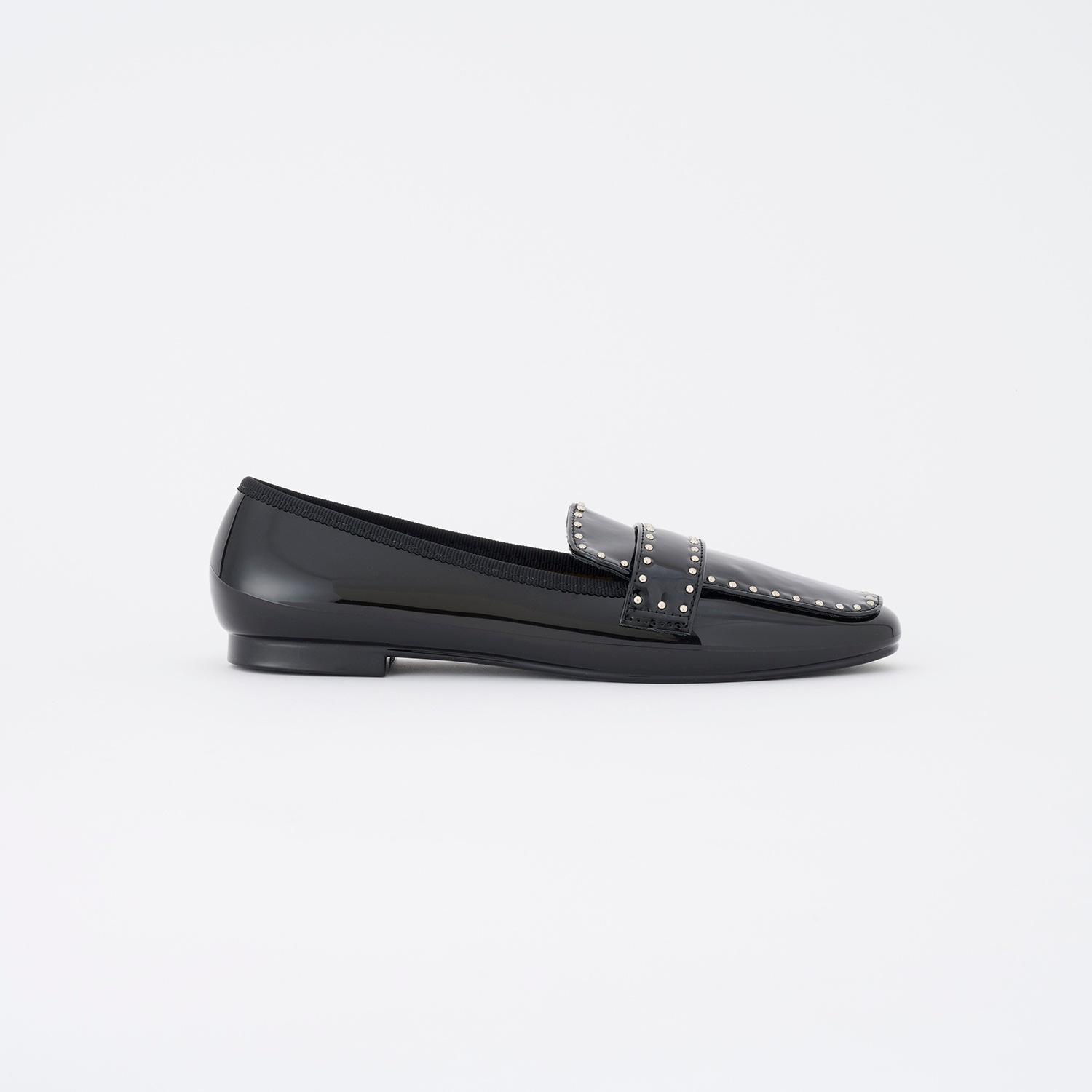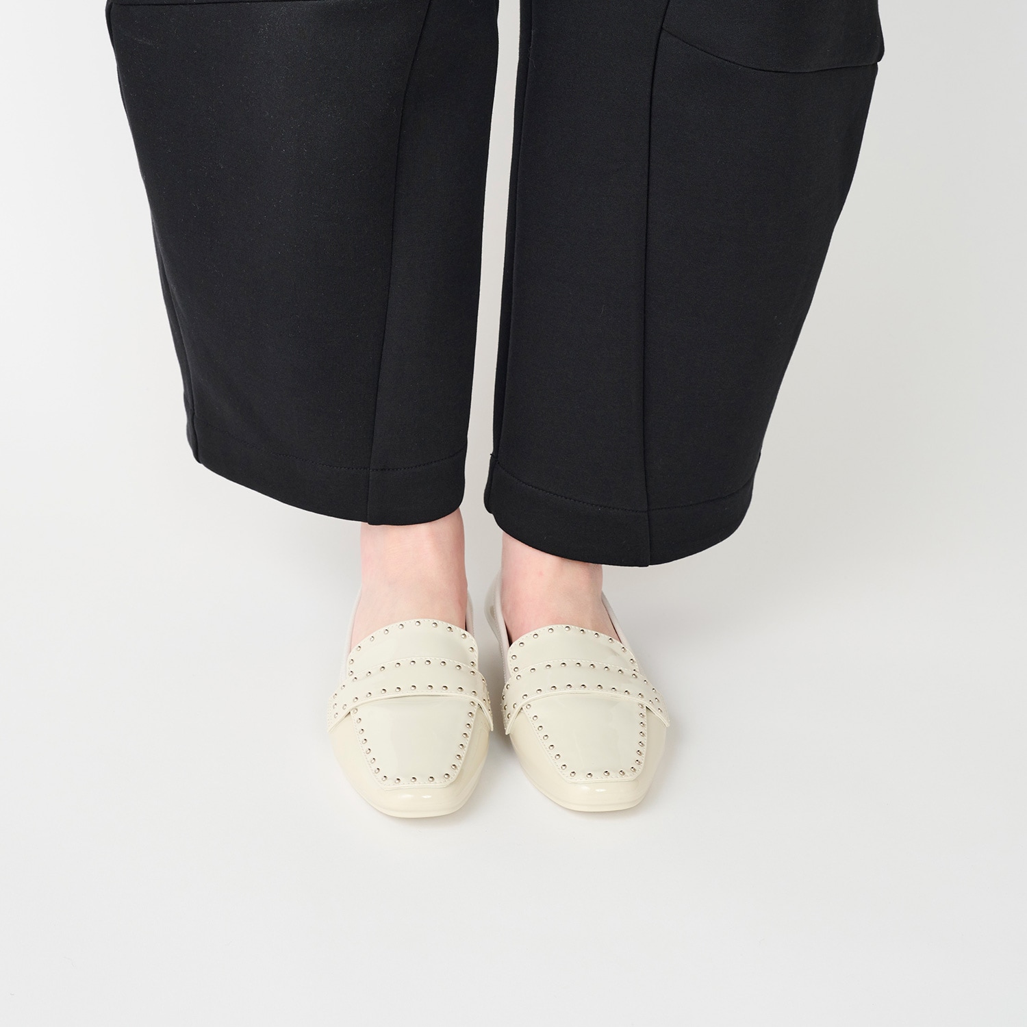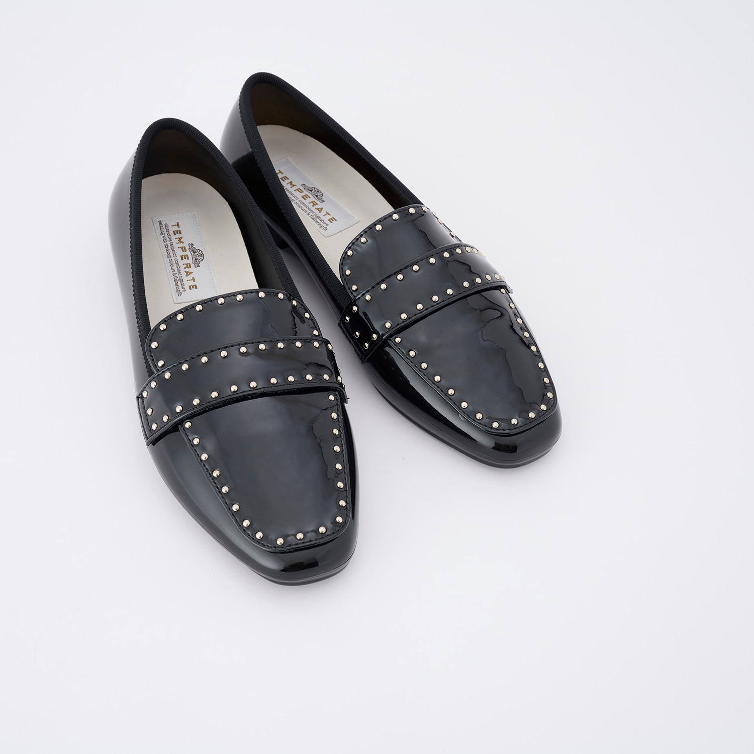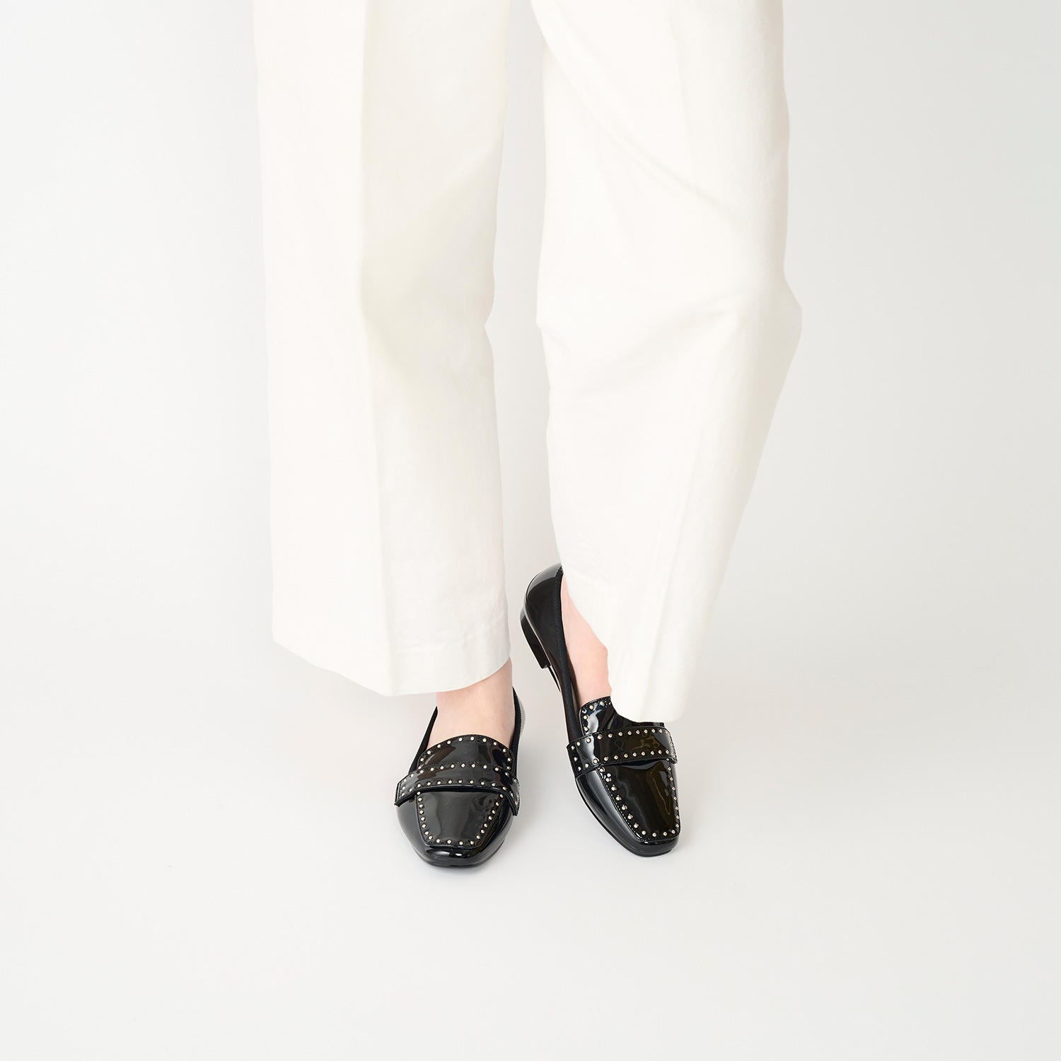 3mmの極小シルバースタッズを、エナメル調の合成皮革アッパーに贅沢に散りばめた「SLOAN(スローン)」。 控えめながらも品のある輝きで、コーディネートのアクセントにぴったりな一足です。